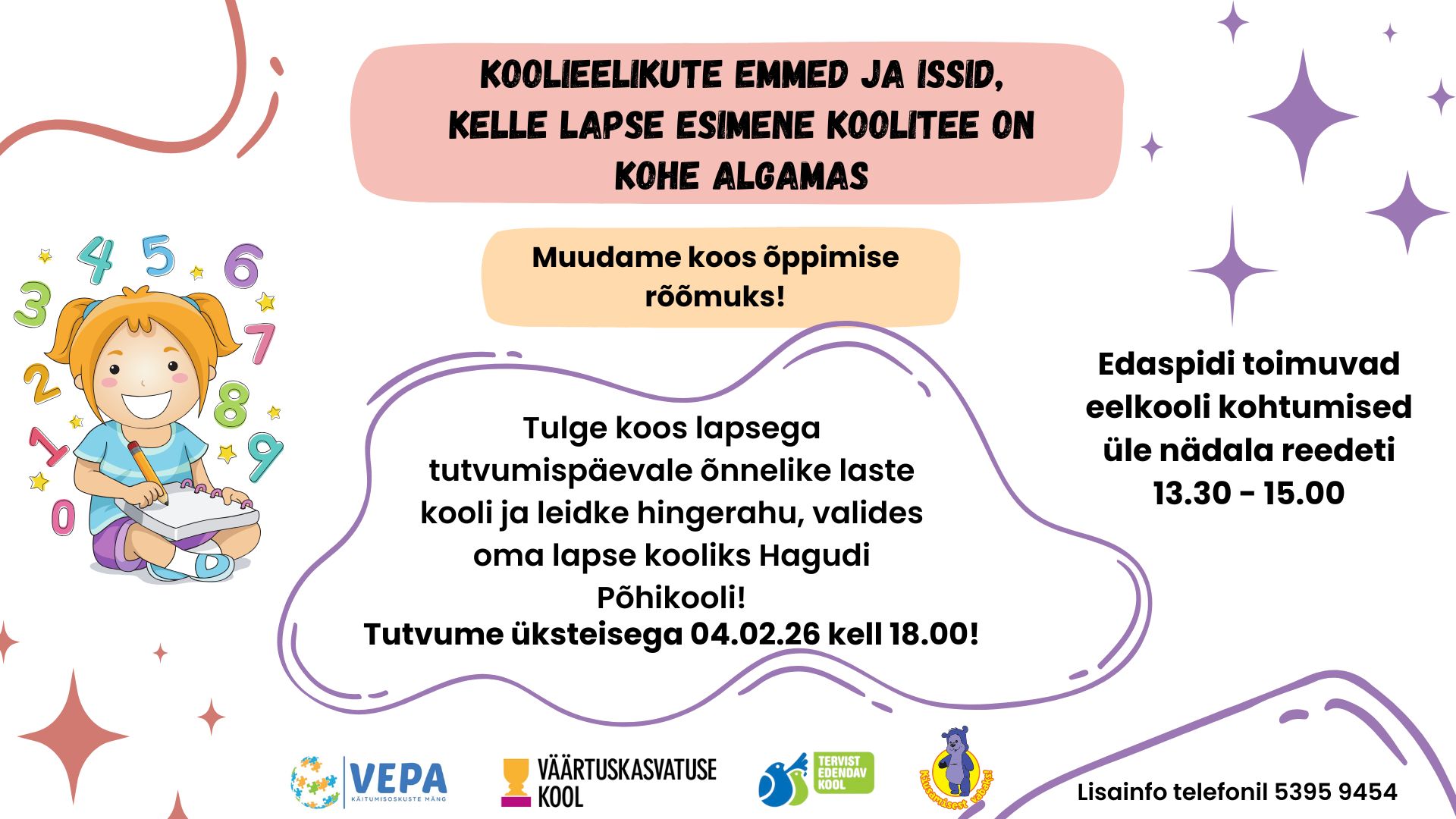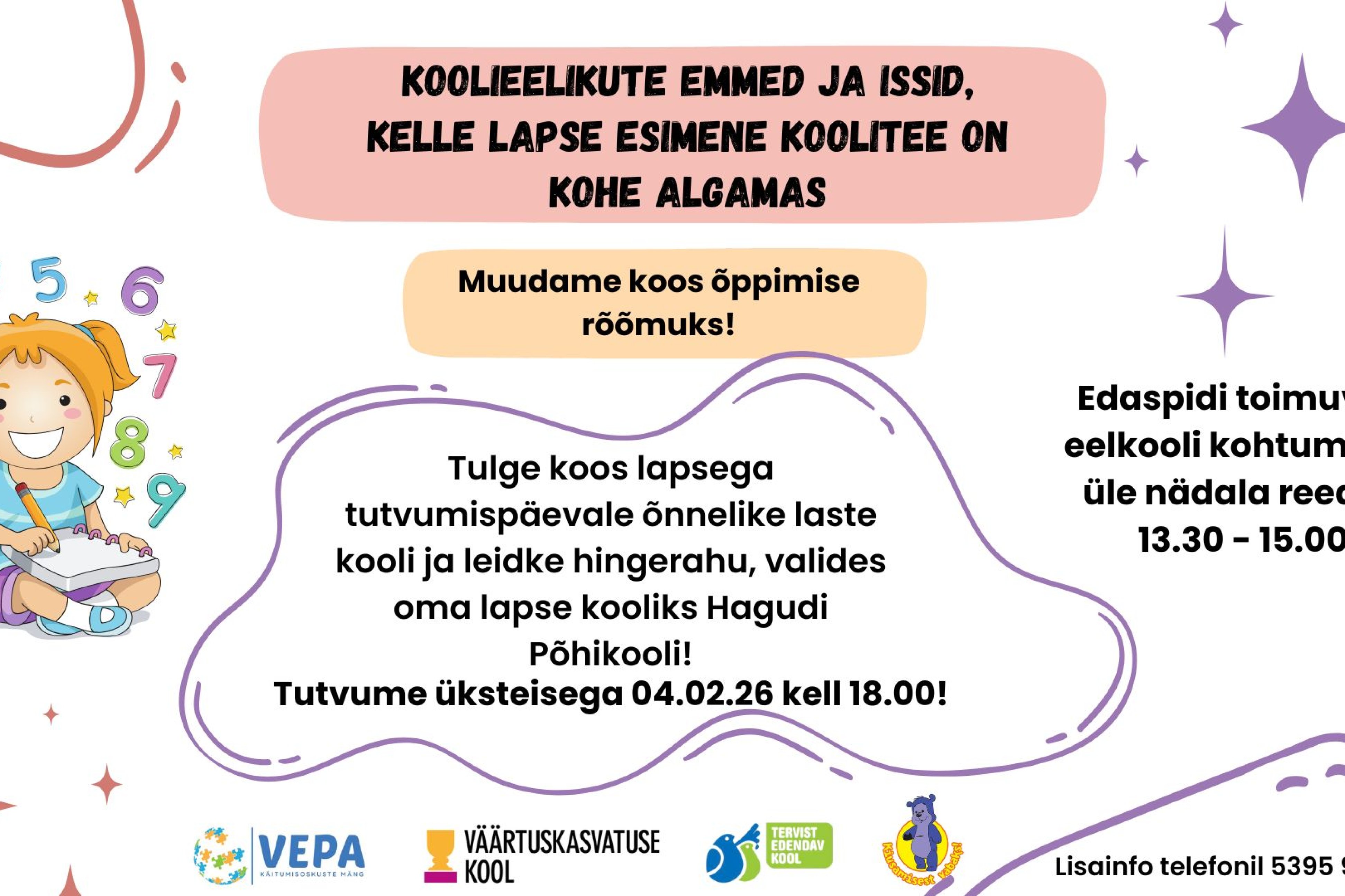 Hagudi Põhikool kutsub teid koos lapsega eelkooli tutvumispäevale 4. veebruaril 2026 kell 18.00